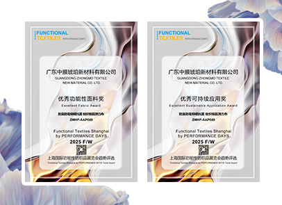 2025上海国际功能性纺织品(秋冬)展览会面料评选会权威揭幕!广东中膜琥珀新材料有限公司一举夺得【优秀功能性面料奖】与【优秀可持续应用奖】双项大奖。
